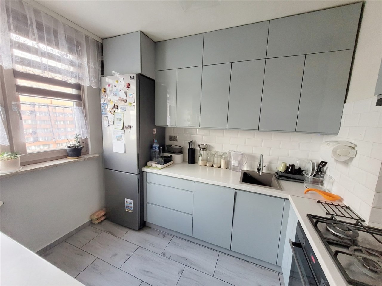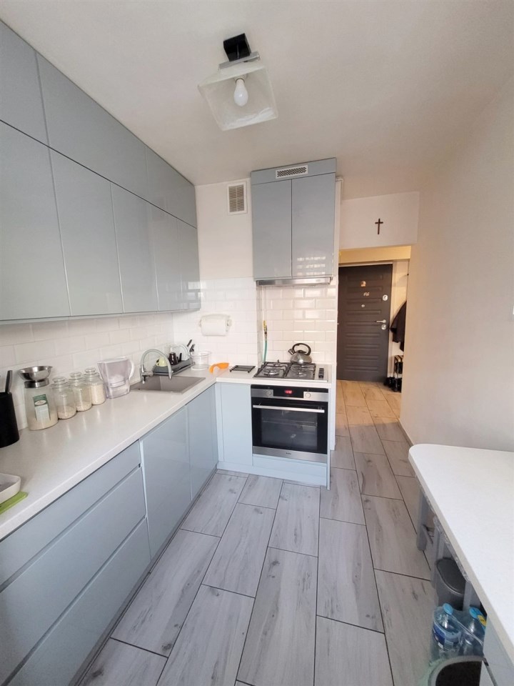 Mieszkanie pięć lat temu przeszło generalny remont. Na podłogach w pokojach położono panele, w przedpokoju oraz kuchni płytki. Wymienione zostały okna (trzyszybowe, na zewnątrz kolor biały, wewnątrz beżowy) oraz drzwi wewnętrzne razem z ościeżnicami. W oknach rolety dzień-noc. Zamontowano również nowe, antywłamaniowe, wysokiej jakości drzwi zewnętrzne marki Delta. W kuchni wykonano meble w zabudowie wraz ze sprzętem AGD - zmywarka, lodówka, płyta gazowa i piekarnik. W łazience położono płytki nowego typu, wymieniono piecyk gazowy oraz pralkę.