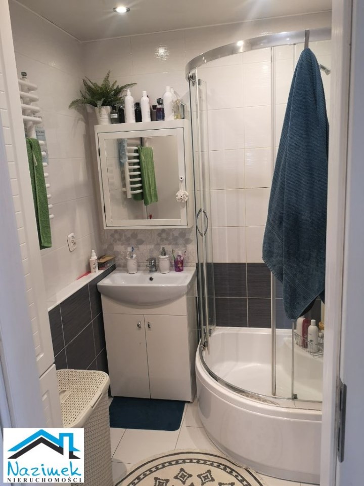 W mieszkaniu na ścianach gładzie, sufity podwieszane, na podłogach w pokojach panele oraz płytki w kuchni i przedpokoju. W łazience płytki, na wyposażeniu kabina prysznicowa.