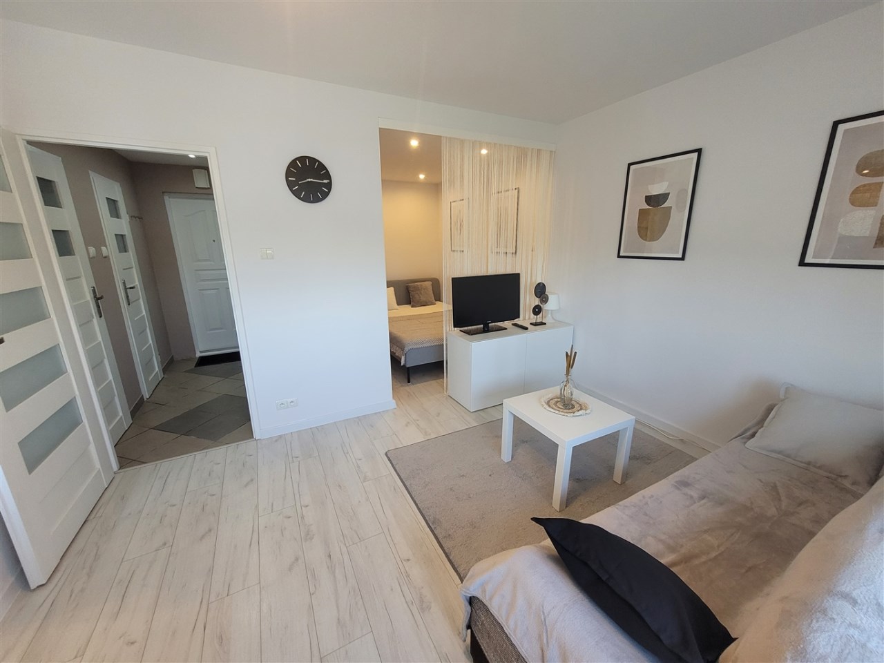 W pokoju funkcjonalna sofa, komody, telewizor. W części kuchennej stół z krzesłami.
